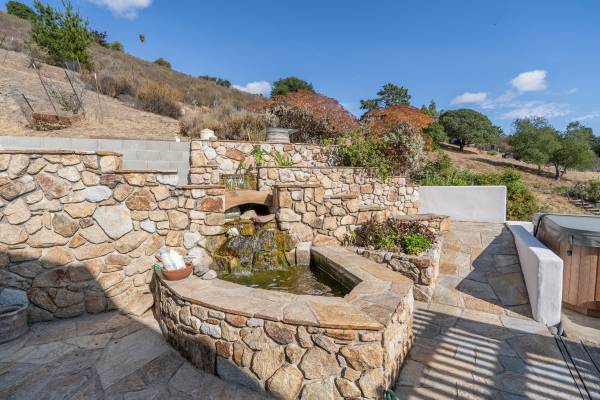 Enjoy stunning views of Carmel Valley and the Garzas from multiple outdoor entertaining areas. The home features a pond with waterfall, a hot tub, and generous patio spaces designed for relaxation and gatherings.