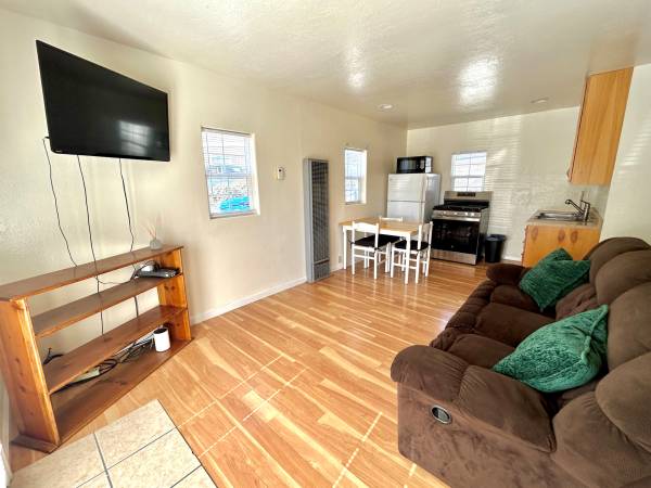 Furnished for your convenience with a mounted flat-screen TV, couch, bed, bookcase, desk, and dining table with three chairs. Additional amenities include a wall heater with thermostat, shared laundry room, and off-street parking in front of the studio.