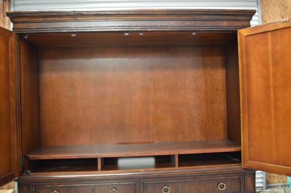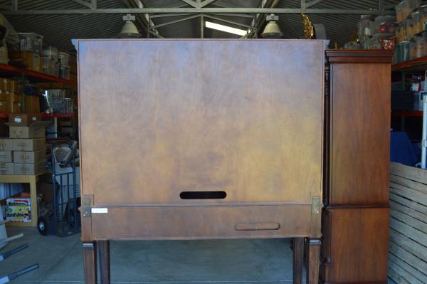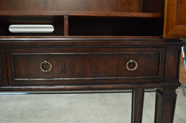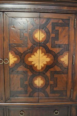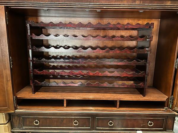 This is a unique and artistic piece of furniture. It was originally designed to hold a TV, but I have been storing wine in it. It could have many other uses. Its outside dimensions are 64" wide, 19" deep, and 82" tall. The inside dimensions of the top cabinet are 68" wide, 15.5" deep, and 31" high. It originally cost $2858.00. The top cabinet and bottom table can be separated for easier transport. I have a truck, so I can deliver it within 20 miles of mid-Carmel Valley.