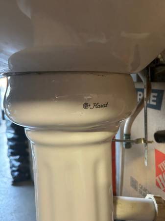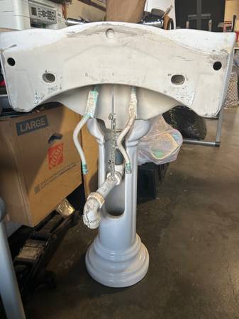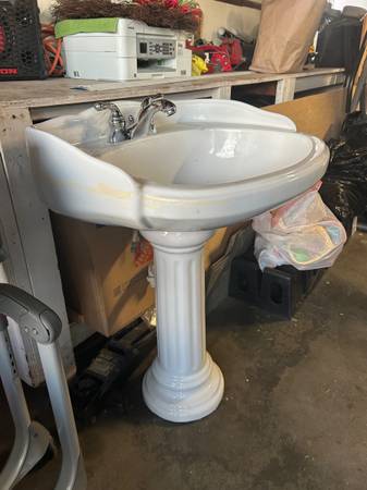 Lightly used pedestal with no damage and ready to be installed with plumbing included and chrome hardware.