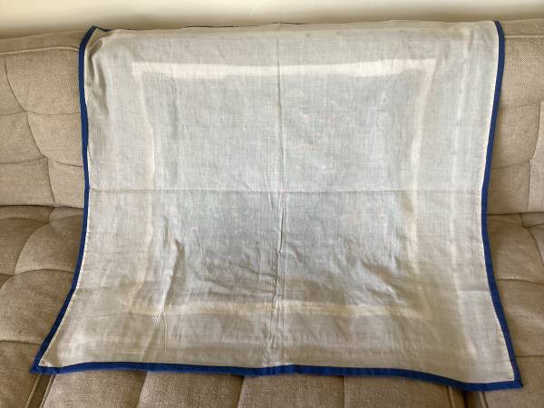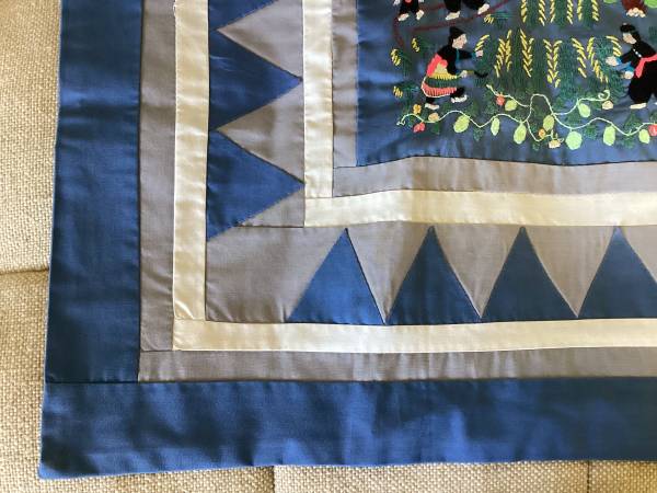 Village story tapestry, colorful and cheerful. One of a kind in the world! Purchased from the Hmong tribes in northern Thailand 30 years ago, brought home in my personal hand luggage, kept clean and safe indoors ever since. Totally hand stitched, including the muslin backing and all of the colorful story embroidery on the front. Dimensions of this folkart piece are 31 inches x 33 inches.
