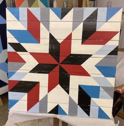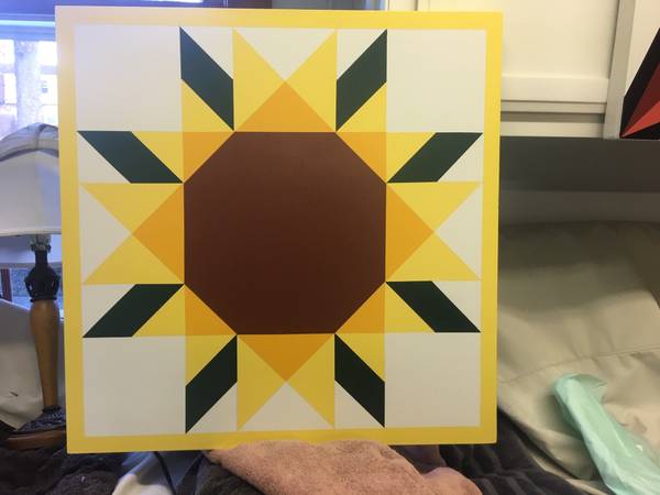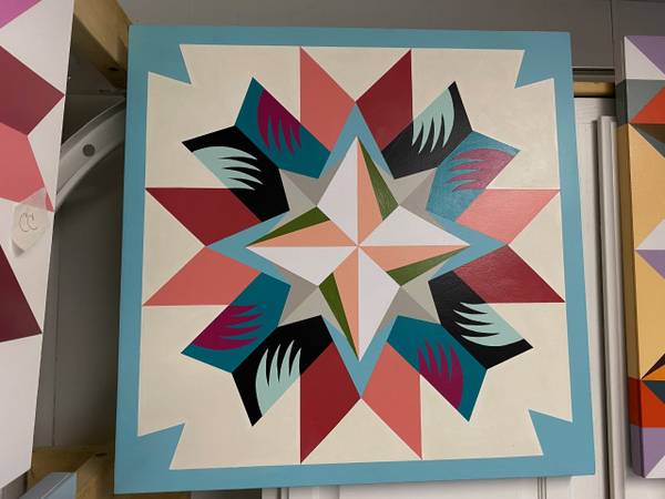 custom hand on exterior painted wood barn quilt art in various sizes.12"x12 "18"x18" 24" X 24" 24" x 36" 30x30 36"x 36" 42x42 48"x 48" 54''x54" 60"x60"