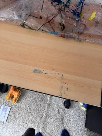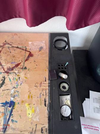 The main part of this desk (not shown) stands up so it can be its own easel. Or down like a flat table. There is a side table that pulls out pretty far. The location this table is in currently I cannot pull it out all the way. It has two drawers, and a small storage at the foot of the table. And little wells for pencils and paintbrushes and things. I also have a medium sized easel that’s on the table currently for another $10.