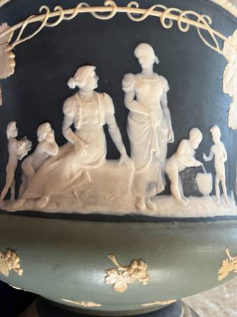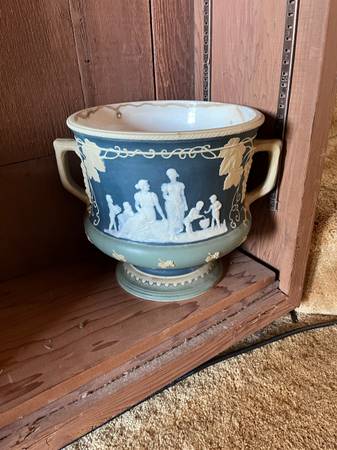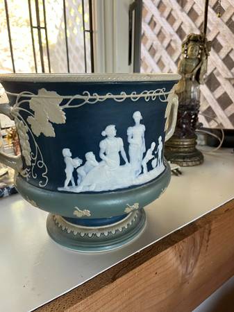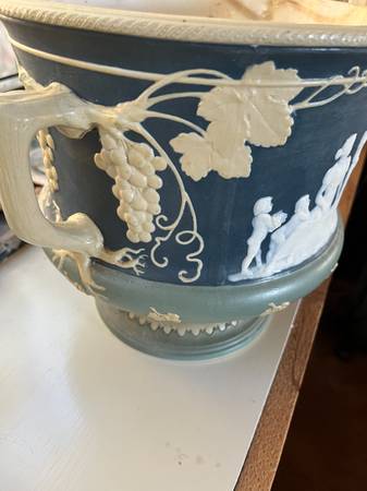 This held a potted plant in our moms home for over 60 years. Condition is wonderful. Beautiful rich color and lovely raised pattern. I could wash it out with some baking soda and remove the patina inside but prefer to leave it. It is a signed piece with the stamp on the bottom. Glaze inside is still in really good condition.