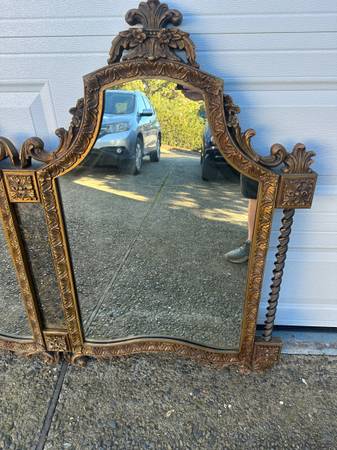 It's in pretty fair shape. Has some dings, chips and scratches. Adds character! The mirror glass is perfect with no cracks. Whole thing is really dusty. Just needs a good cleaning.