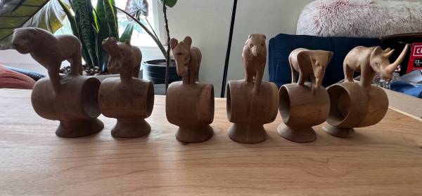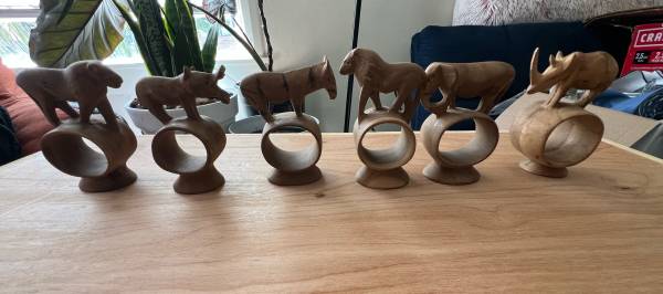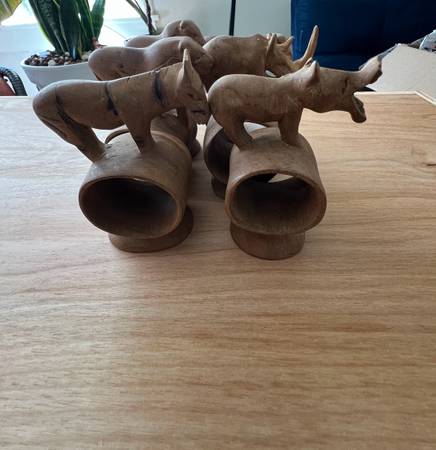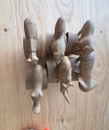 Vintage hand carved set of wooden animal napkin rings from the 1970s