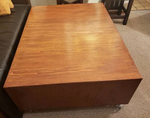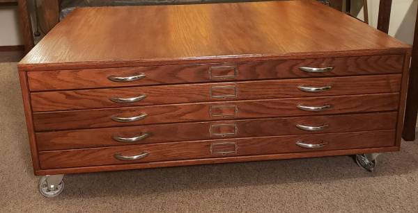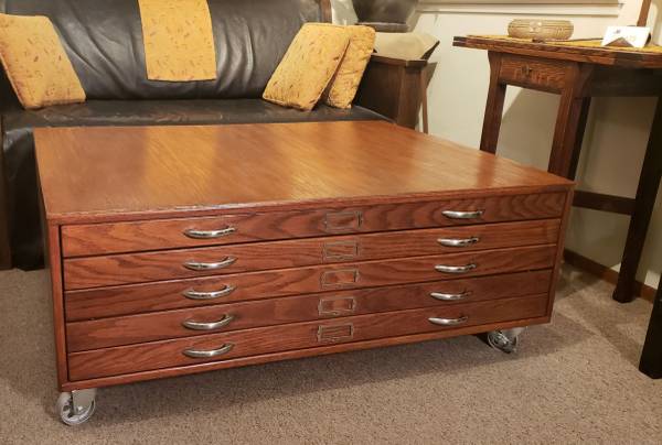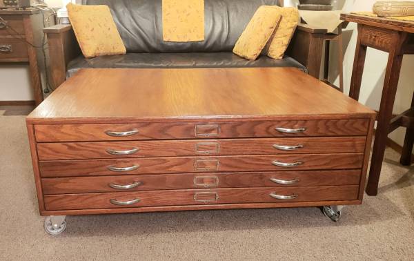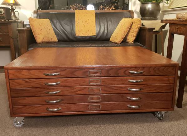 Vintage Mid-Century oak flat file cabinet converted to a coffee table that can hold architectural plans, art, maps or your poster collection.