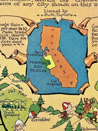 Here is an original 1930s cartoon map of the Monterey Bay region by Ruth Taylor. Very nice vintage condition. Measures approximately 8 1/2“ x 11“. Please see photos for details. $100. If interested,...