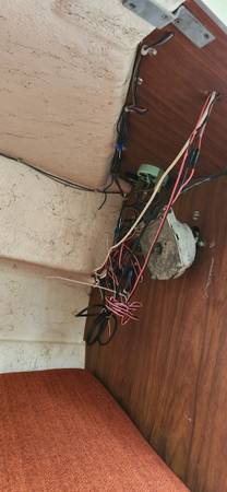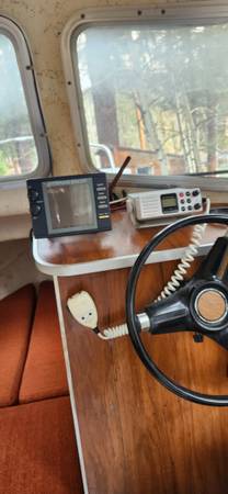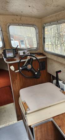 Regular wear and tear. Some nicks along rub rail, and some water stains on lower cabin panels. Captain chairs and bunk cushions in good condition, clean and no tears. Can include a 5HP Yamaha trolling engine (likely needs a tune-up), some accessories: gas can, anchors, downrigger, etc.