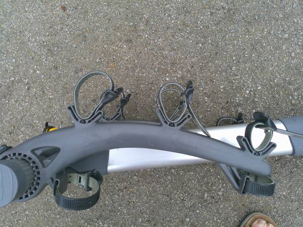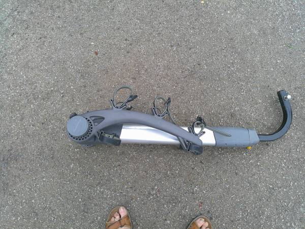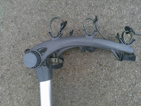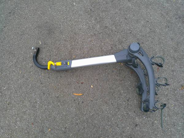 Saris 3 Bike rack fits 1" in receiver 2" adaptors available This lightweight rack has been used. "Not" recommended for heavy e- bikes. Comes with receiver bolt and keys for the lock set up.