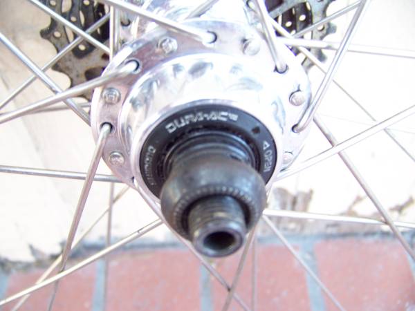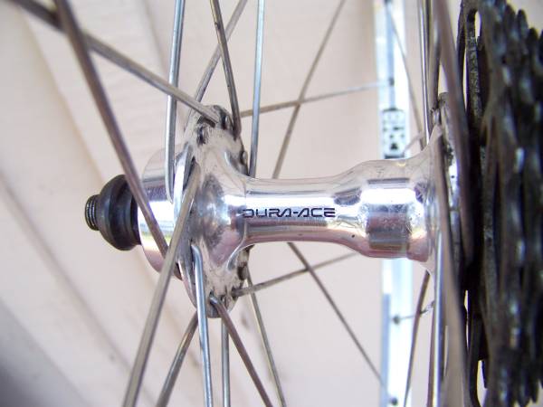 Shimano Dura Ace 7400 series clincher road bike 700c rear wheel/Sun USA rim, 9 speed cassette. Very nice condition. $99 .