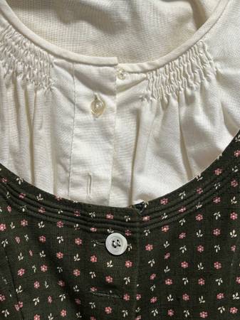 Authentic German Dirndel dress Bought in Germany Size medium Very well made Nice material Has separate blouse and apron Dress is a dark green background with small pink flowers Apron is pink and...