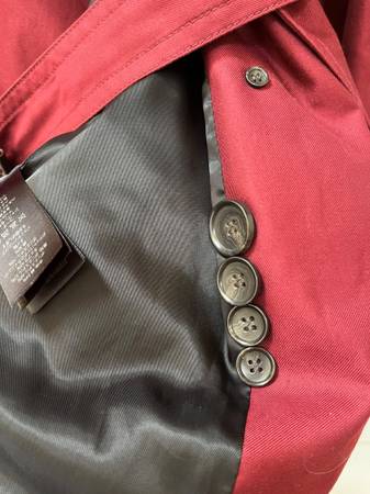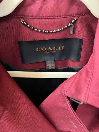 Barely worn, (stored in protective garment bag) half length, lovely, dark red Coach woman's trench coat for sale. In as new condition, size small. Classy, timeless lines/ belt. Buttoned split back fold. Purchased new in Carmel. Approximately 17 across shoulder, 29 in height.