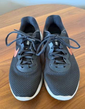 Sleek black Nike revolution 6 shoes with copper swoosh. Lightweight and comfortable. Ideal for running or casual wear. In very good used condition. Women’s size 7.5.