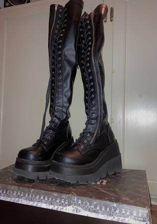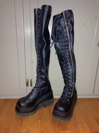 Used Demonia Shaker-374 Knee-High Boots for sale. Women's Size 10. Vegan leather, Great condition. Little wear. Local pick up only. Serious Inquiries only. Thanks!