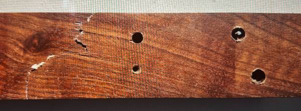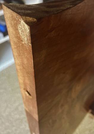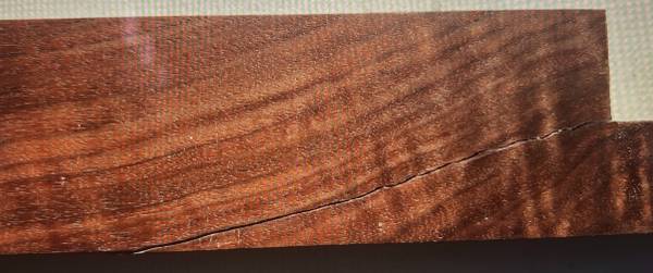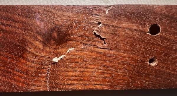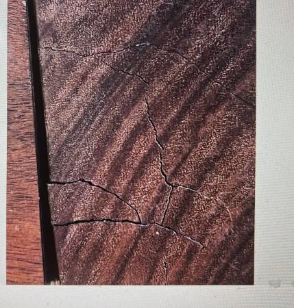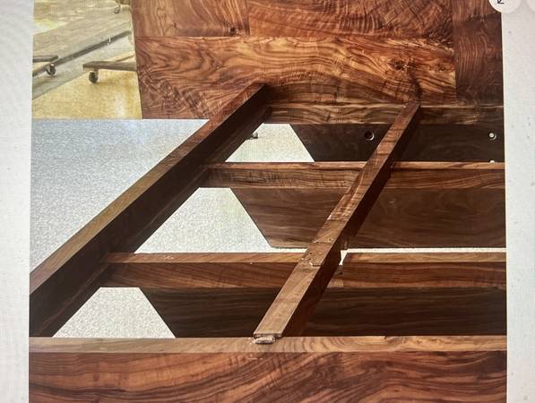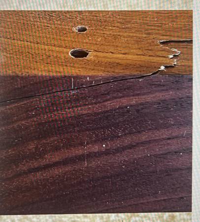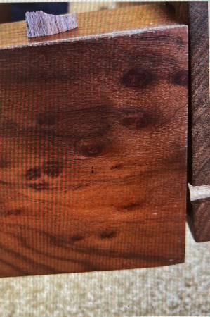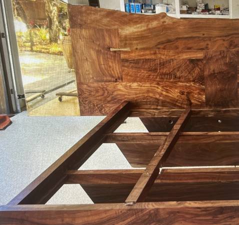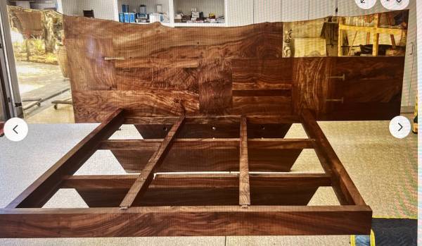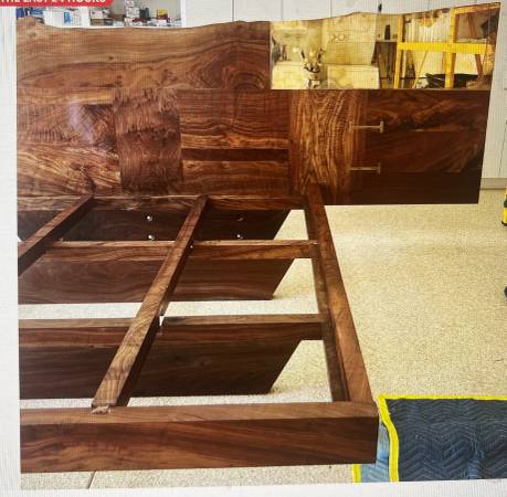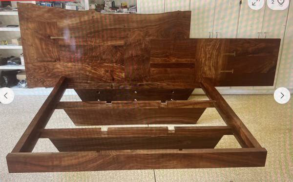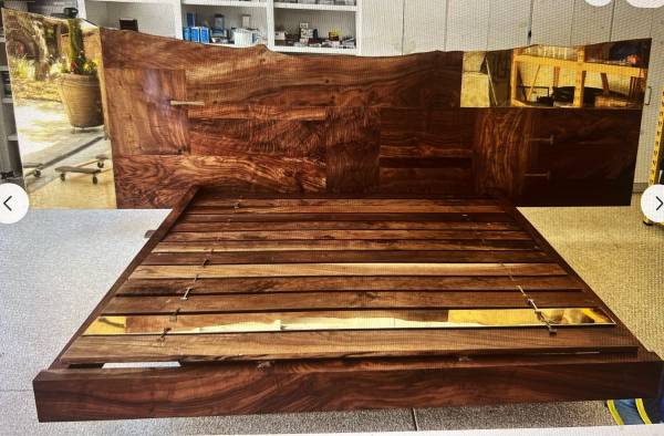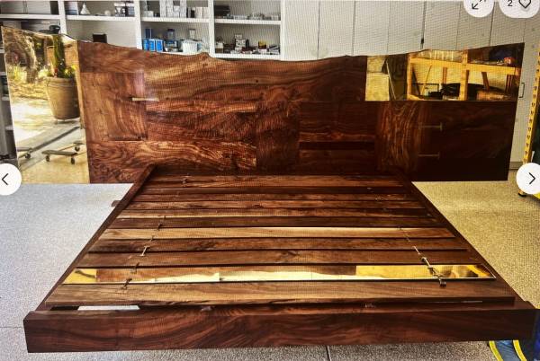 For Sale: a fabulous used Hudson Marquis Bed. It is comprised of various seamed planks of walnut accented with polished solid bronze ends of the headboard. It is held together with bronze butterflies. The head board measures 13 feet and 8 inches long and 55 inches tall. The mattress frame measures 76 x 80 inches which constitutes a King Size bed. The bed has a few minor issues as follows: The left center support beam from headboard to footboard is was cracked apart and poorly repaired with wood glue and screws. This occurred when someone assembling the bed improperly forced the joints together with a hammer or heavy device. The bed frame has two small chips of which one has the chipped off piece available . The size of the other chip which has no replacement piece is shown next to a penny. The headboard has a few check fractures to the finish.