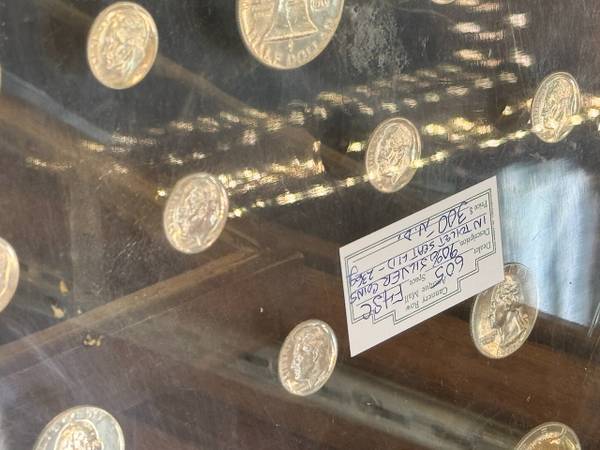 This hoard of silver coins is available in the Cannery Row Antique Mall located at 471 Wave Street, Monterey, in space F4, the showcase. The mall is open daily from 11:00 AM to 6:00 PM. The price is a firm $300.00, no discounts are available.