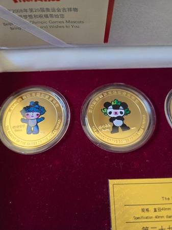 This commemorative medallion set features the 2008 Beijing Olympic Mascots and comes in its original box. The set includes five coins that represent the colors of the Olympic rings and feature the beloved mascots of the Beijing games. The medallions are a perfect addition to any Olympics or sports memorabilia collection. The set is a rare find and a must-have for fans of the Chinese team or those who cherish the memories of the Beijing 2008 Olympics. The medallions are in excellent condition and have been well-preserved in their original box. Get your hands on this unique and beautiful set today!