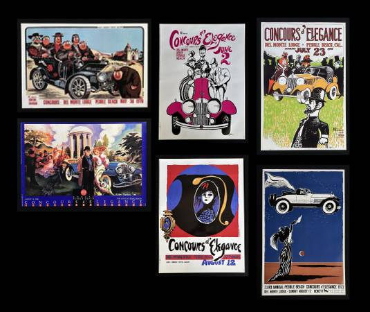 Lot of 800 original second printings of Pebble Beach Concours posters by cartoonist Eldon Dedini of Esquire, New Yorker, and Playboy note. Dedini created the art for nine years of the Pebble Beach Concours, from 1966-1973 and 1990. This lot includes six of these titles: 1966, 1967, 1968, 1970, 1973 and 1990.