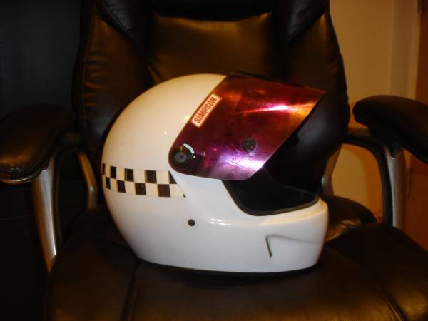 The Simpson racing helmet is size 7 1/8 and it has the manufacturing date of 1993. It has the lift-up style visor on the front that is tinted as well as a clear visor. The overall condition is excellent. This racing helmet is a collectible and it looks great for display.