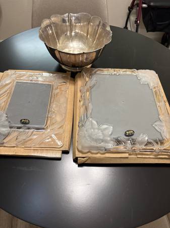 Selling a Silver Plated Bowl and (2) new Glass Picture Frames. Asking $20 for all. Call Joe at . Cash only and must pick up. Thank you.