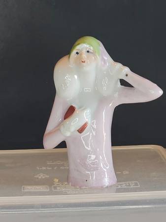 VTG half doll / pincushion doll Flapper girl in liliac/pink coat holding a book wearing green bonnet. Made of china or porcelain in Japan handpainted likely in early 20th century.