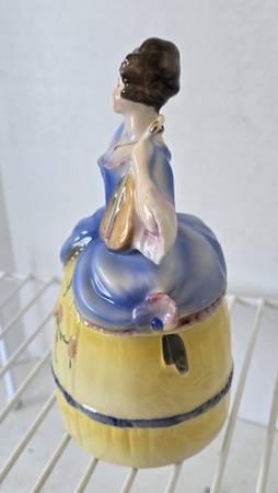 VTG Porcelain Trinket / powder box. Lady with light brown hair in a yellow and blue dress holding a violin. Handpainted likely in early 20th century. Please