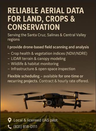 I provide drone-based field scanning services across the Santa Cruz, Salinas, and Central Valley regions. Whether you manage farmland, wildland, or public infrastructure, I deliver accurate, GPS-referenced imagery using multispectral, LiDAR, and RGB sensors to help you make smarter, faster decisions.