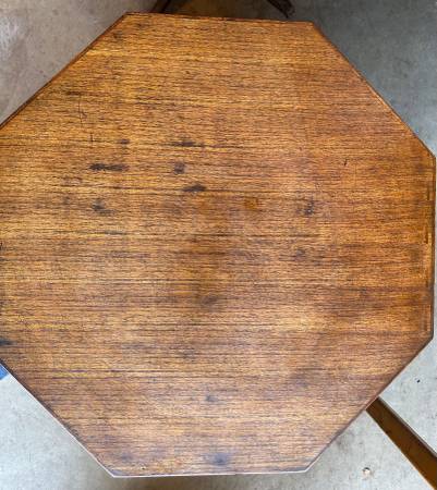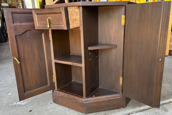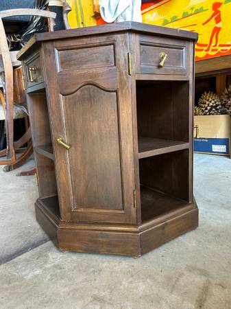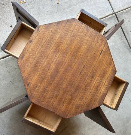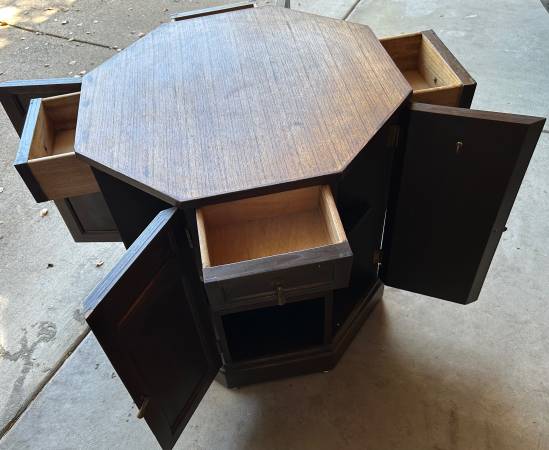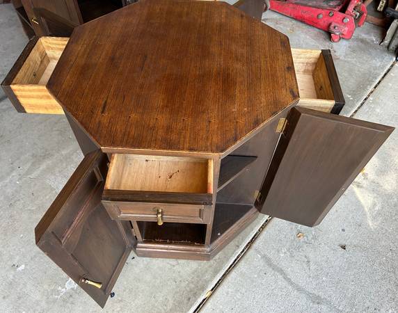 Four sides have drawers with brass pulls and a shelf under the drawer