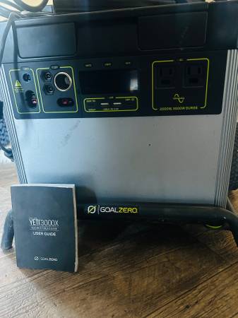 This Goal Zero Yeti 3000X is like new! We were never able to use it, before moving to Northern California and no longer need. It equips you with 3,032 safe, clean, portable Watt Hours, to power your home, work office, as well as while driving on the road. The Outlet Anywhere Increased 2000W AC (3500W Surge) Inverter, can handle surges from power tools, medical devices, and home appliances, including full-size refrigerators. You can also power a wide range of devices with seven different port options, including fast-charging 60W USB-C Power Delivery, multiple USB-A ports, regulated 12V, and two 120V AC ports. The Goal Zero Power App helps you control and optimize your power usage from anywhere. It features remote control of power in/ out, real-time power consumption notifications and charging profiles to optimize your battery life. You can recharge in 14 hours, by plugging the 230W Power Supply AC Wall Charger in the wall, or recharge within 6 hours using the available 600W Power Supply. It can also be charged, by plugging the Goal Zero Yeti Lithium 12V Car Charging Cable into your 12V adapter. It's too heavy to ship, must be picked up only. It sells for $2700 brand new. Only serious inquiries, which means you’ll follow directions and only call me.