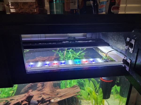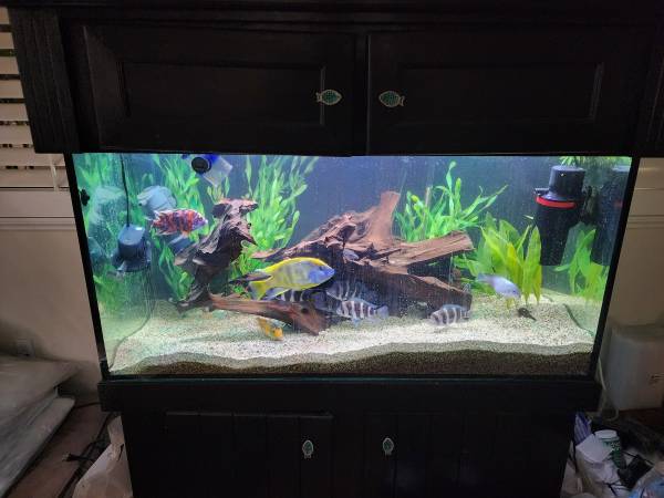 125 gallon aquarium stand hood lights 2 canister filters giant decorative real wood piece 2 Led light strip bars