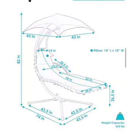 Base dimensions: 43 in. long x 43 in. wide; bed size: 66 in. long x 29 in. wide; seat height: 18 in. ; umbrella dimensions; 45.5 in. wide x 44.5 in. long