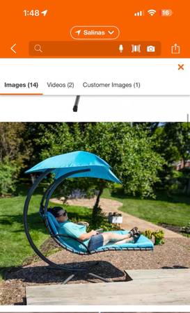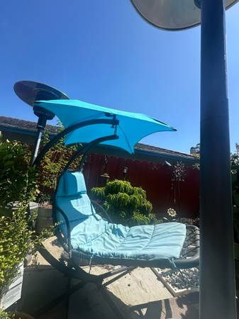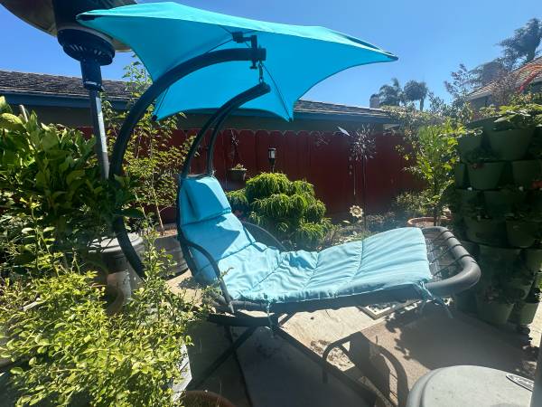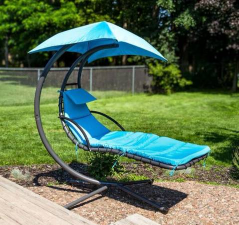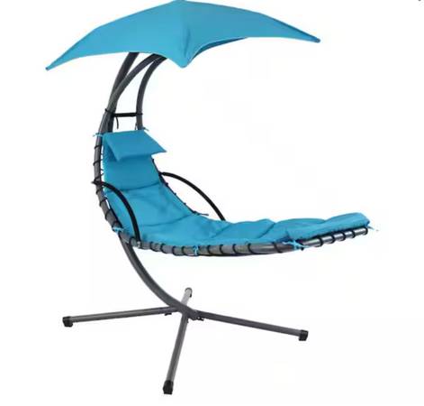 Like floating on a cloud, this hanging lounger will add comfort and style to any garden, patio or yard. Boasting sumptuous padding, a comfortable headrest and a durable, powder-coated steel frame, this crescent moon-shaped chair will provide hours of rest and relaxation. The soft polyester chair pad easily ties on to the frame while the black padded armrests give a comfortable place to rest the arms. The chair also features an umbrella to shade from the sun and help be more relaxed.