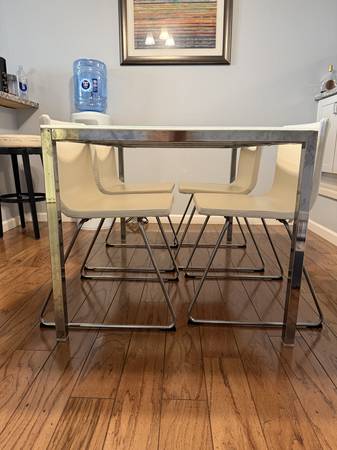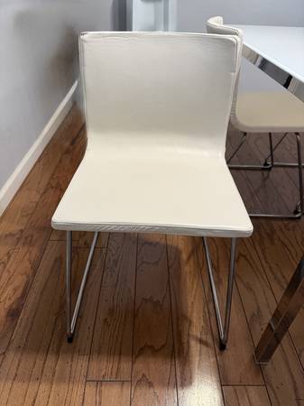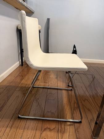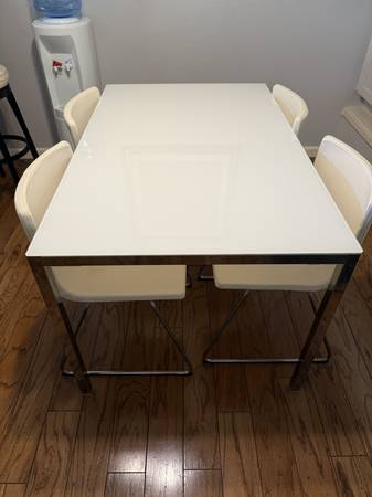 Selling 4ft, 5 inch long by 2ft, 9 inch wide contemporary white stained glass table with white leather chairs. This table is in excellent condition.