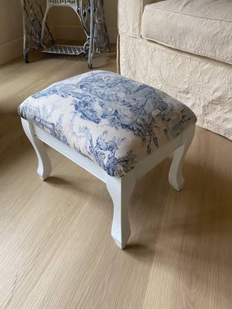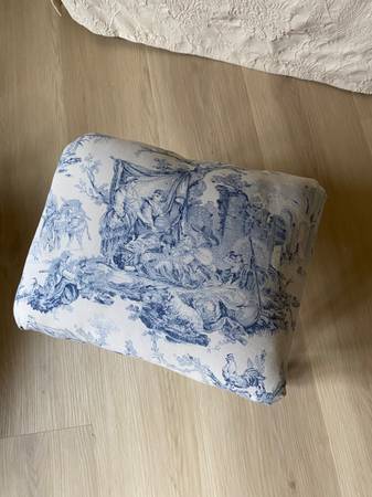 Recovered with blue and white Toile De Joiey fabrics. 16 in W x 12 H x 13 W