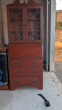 Beautiful antique secretary. At least 80 years old and in great condition. 3 drawers. Flip stationary area and 3 upper shelves Open to offers