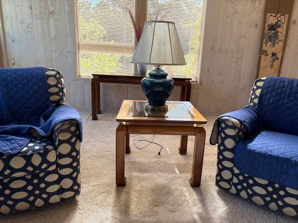 Three matching tables One sofa table. $40 One coffee table $40 One side table $30 OR $85 for all three Solid wood with beveled glass tops