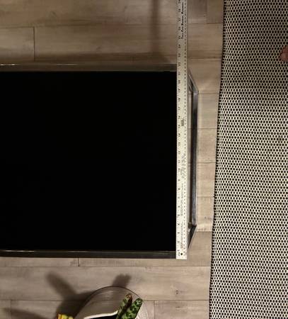 Modern, black glass coffee table. 3 1/2' wide, 22" deep and 15" tall.Missing one screw on bottom but it's an easy fix. Text Okay,831-601-18 four three.