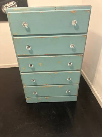 Five drawer dresser with Crystal knobs leave shabby chic or put on a fresh coat of paint to customize to suit you. Priced to sell at only $100
