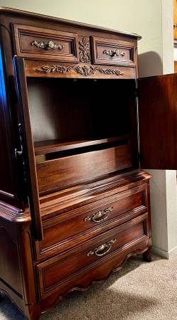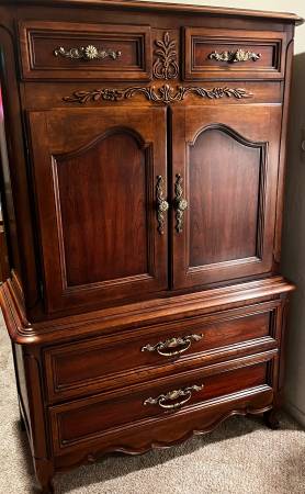 Hardwood, well built from Dixie. Not too heavy, tall or huge but lots of storage. 17.5 depth, 56 high, 40 wide Call or text Heather