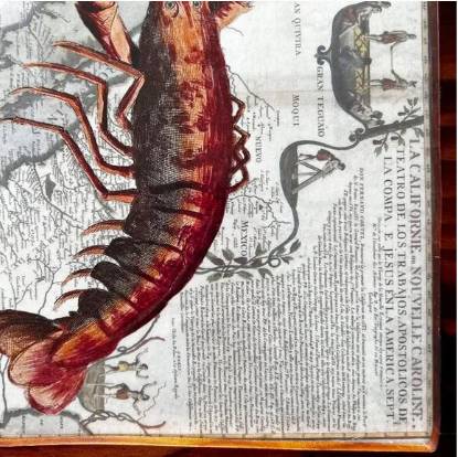 Lobster print on a historical discovery map featuring California and Mexico.