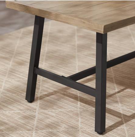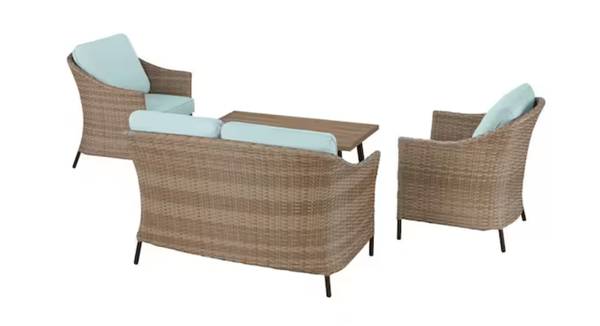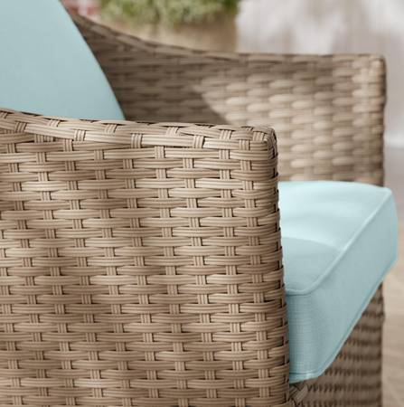 Light Blue Cushions perfect condition Conversation Patio Set Small Sofa and 2 Chairs used just one season Seats 4 Beautiful Light Blue Fabric Coffee Table was inside - like new Sofa & 2 Chairs