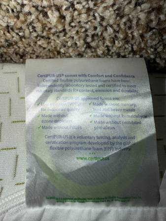 Healthcare Foam, S.L. Face: 92% Polyester, 8% Bamboo Back: 100% Polyester Bottom: 100% Polyester Inner Cover: 100% Cotton All labels are attached.