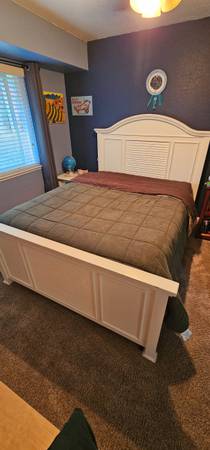 Queen bed frame and head board. Night stand with drawer. Cabinet with glass doors. Minor scuffs, but over all condition is solid.