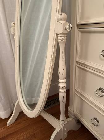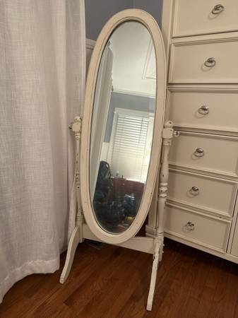Full length oval mirror on a wood stand. Sits on floor. Can adjust tilt of mirror from vertical to angled. Cottage-style, distressed cream finish. 5 ft tall, 18 in wide.