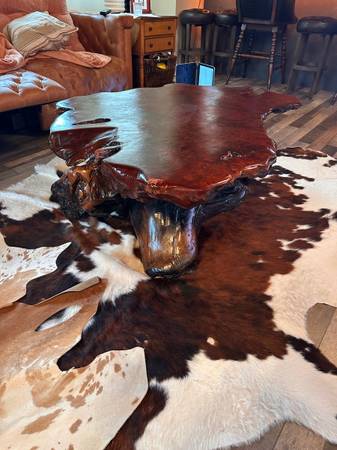 Heavy redwood Burl coffee table. Roughly 50” x 40”. 18” high.