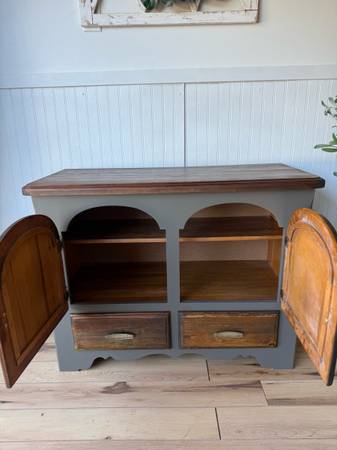 Featuring two cabinet doors with vintage brass hardware and two spacious drawers below, it’s as functional as it is charming.