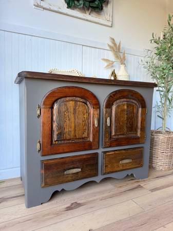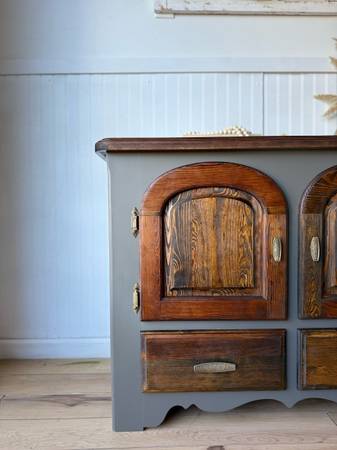 The frame is painted in a rich, warm gray that perfectly complements the wood tones of the doors and drawers. The solid wood fronts have been carefully sanded, stained, and sealed to highlight their beautiful grain and variation, giving this piece a warm, organic feel.