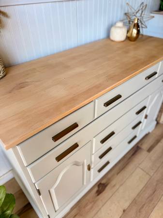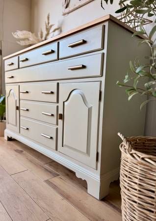 The piece features a soft, elevated neutral finish that brings a light, timeless elegance, paired with a warm natural wood top that has been carefully restored to highlight its grain and character. Updated hardware adds a subtle modern touch while honoring the buffet’s classic lines and craftsmanship. Spacious drawers and cabinets provide generous, functional storage, making this piece as practical as it is striking.