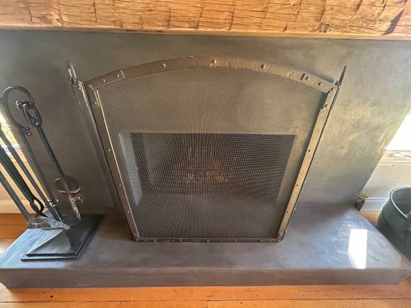 Screen is made of iron with rustic finish. Tools set includes: 1 set of tongs, 1 shovel, 1 brush, 1 poker, and 1 stand.